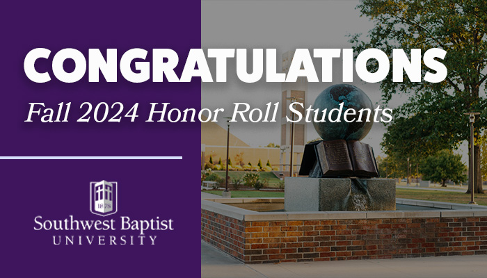 To be listed on the University’s honor roll, students must carry at least 12 hours of college work at Southwest Baptist University and earn at least a B (3.00 GPA), with no grade below C: Trustees’ List, 3.85-4.00; President's List, 3.70-3.84; Deans’ List, 3.50-3.69; and Honor's List, 3.00-3.50.